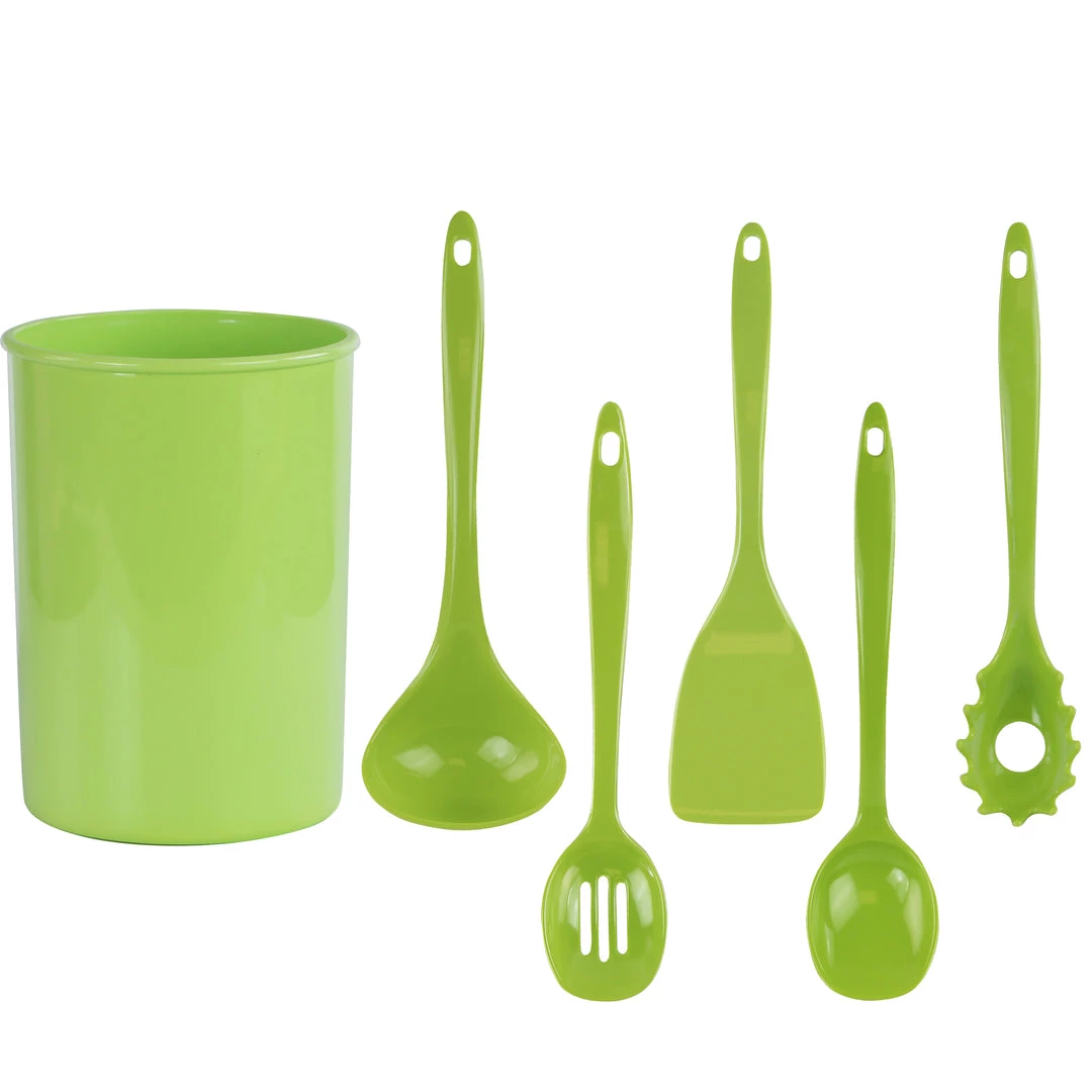 - Set Contains: Utensil Holder & 5 Utensils (Spoon, Slotted Spoon, Ladle, Spatula, Spaghetti Fork)