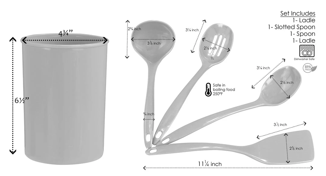 - Set Contains: Utensil Holder & 5 Utensils (Spoon, Slotted Spoon, Ladle, Spatula, Spaghetti Fork)