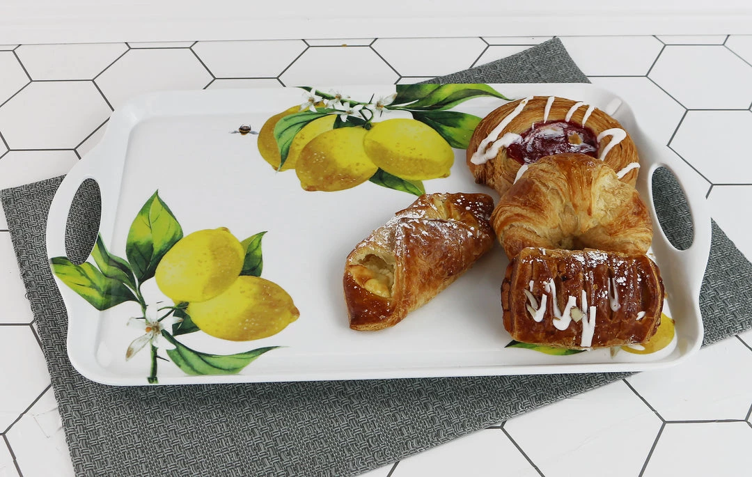 Our melamine trays can do so much for you. The rectangular tray can not only carry and serve items but can by used for appetizers as well. Match up the large tray with our tidbit tray for a great serving set. Great for both indoor and outdoor use. Decorated with juicy lemons and playful honey bees that are sure to delight!