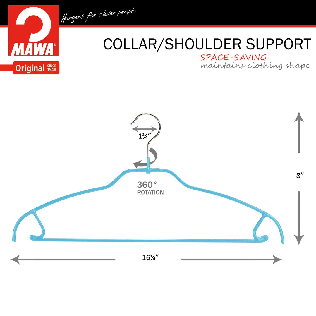 SPACE SAVING | Each hanger is only .12 inches or 1/8 of an inch thick. However, it can hold up to 8 pounds. Gain up to 40% of additional closet storage space. Unlike other companies, MAWA is made to last.