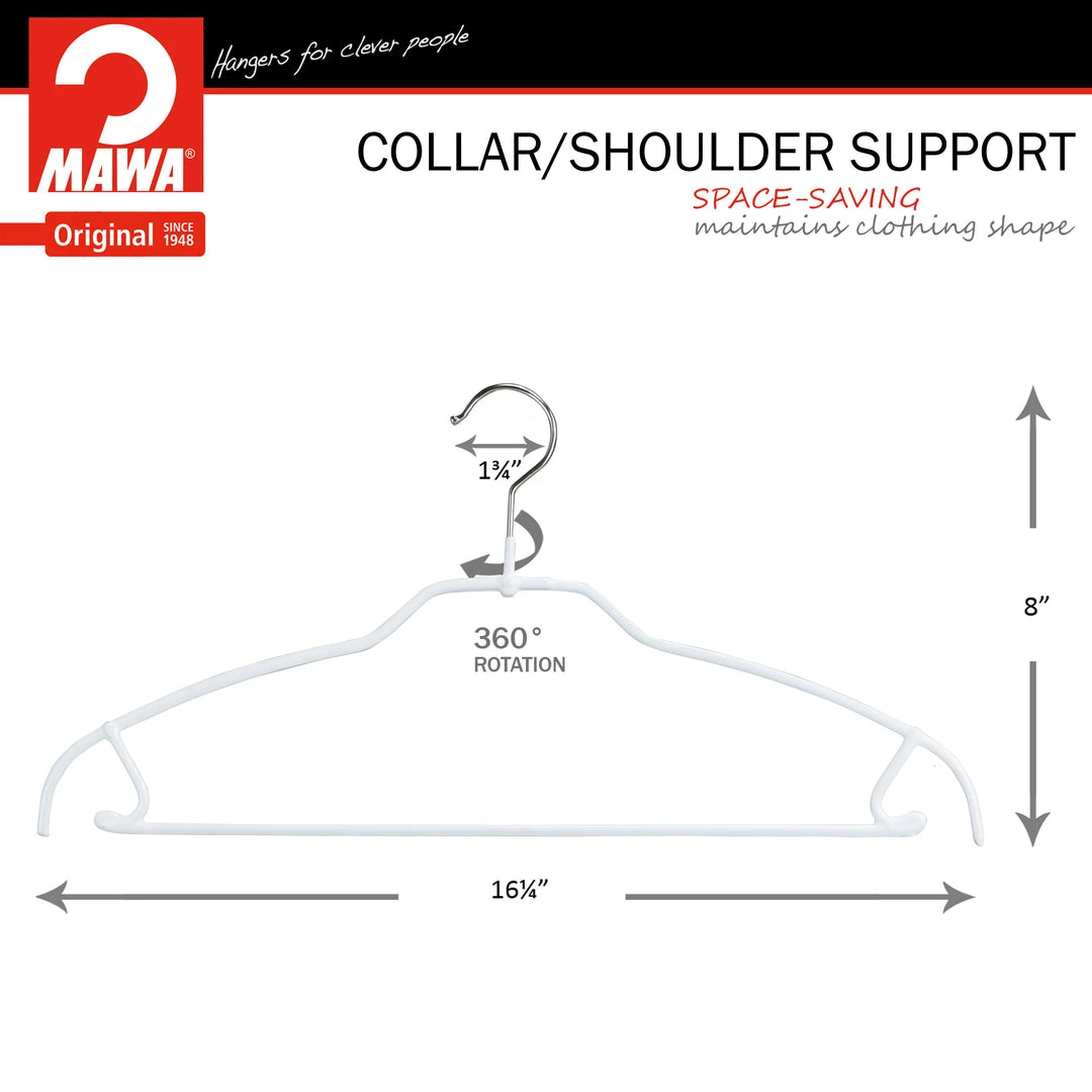 SPACE SAVING | Each hanger is only .12 inches or 1/8 of an inch thick. However, it can hold up to 8 pounds. Gain up to 40% of additional closet storage space. Unlike other companies, MAWA is made to last.