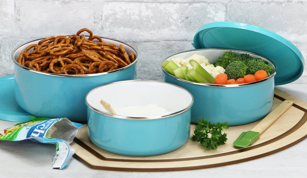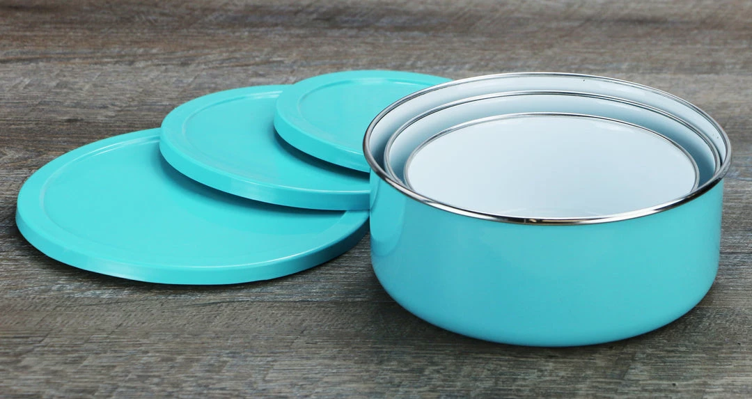 Enamel on steel bowls with Plastic (BPA free) airtight lids