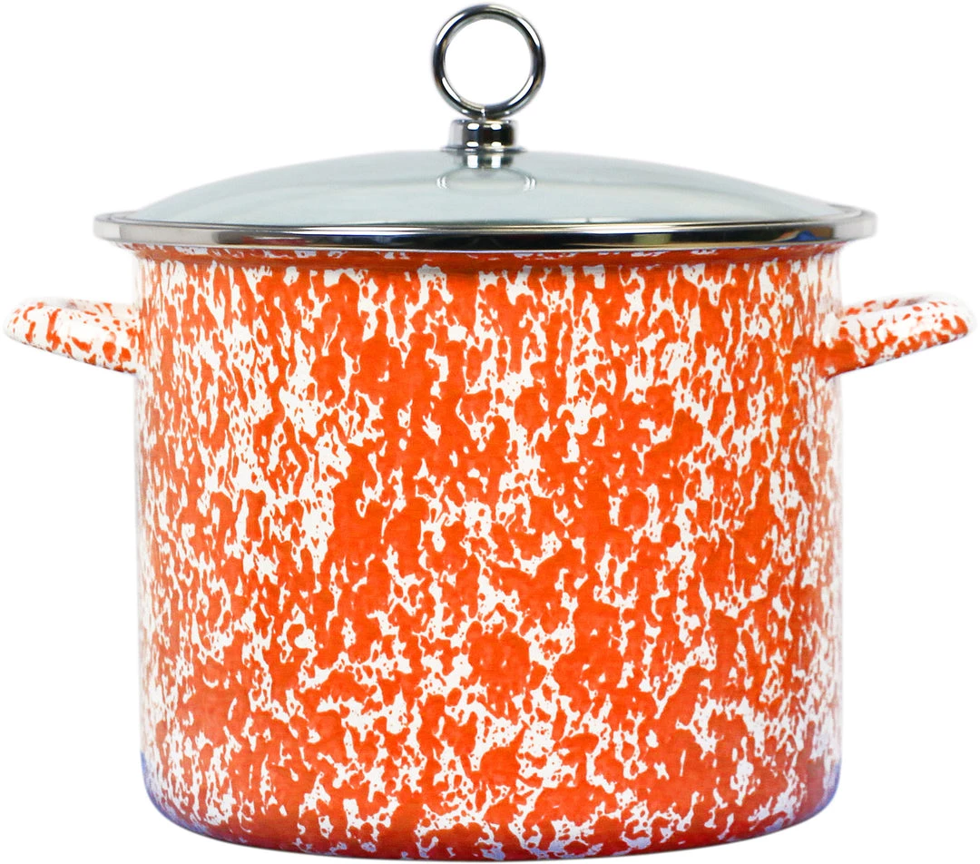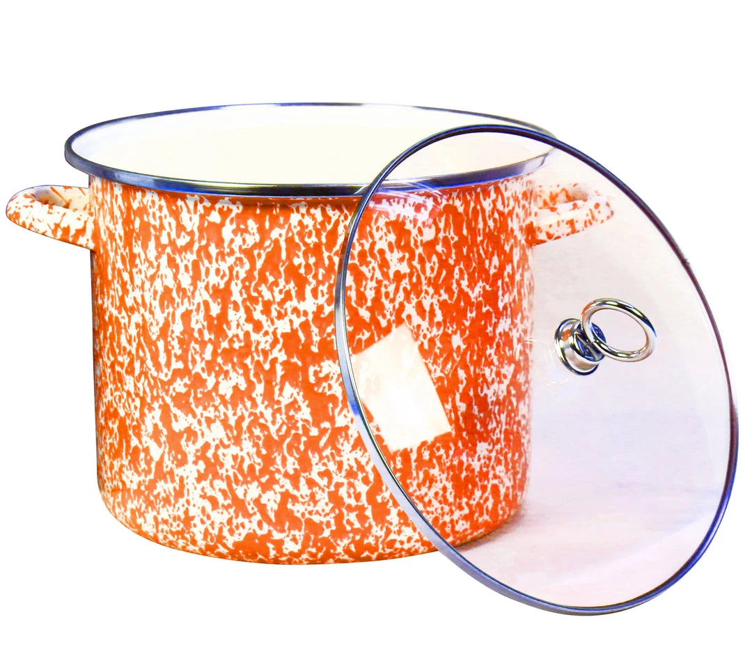 This heavy gauge carbon steel stock pot is covered with a porcelain finish which allows for even heat distributions, and is versatile for any cooking range top. The stock pot is constructed with German handles to ensure a comfortable feel and ability to handle the weight of a full stock pot. The handles are seamlessly molded into the construction to allow for a beautiful feel and look. Heat tempered glass was used for the lid to allow you to peek on your cooking project while on the stove. Enjoy cooking stews, chili, seafood and more in this 8 quart stock pot.