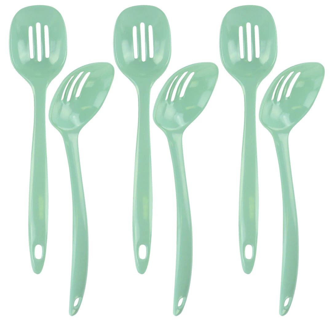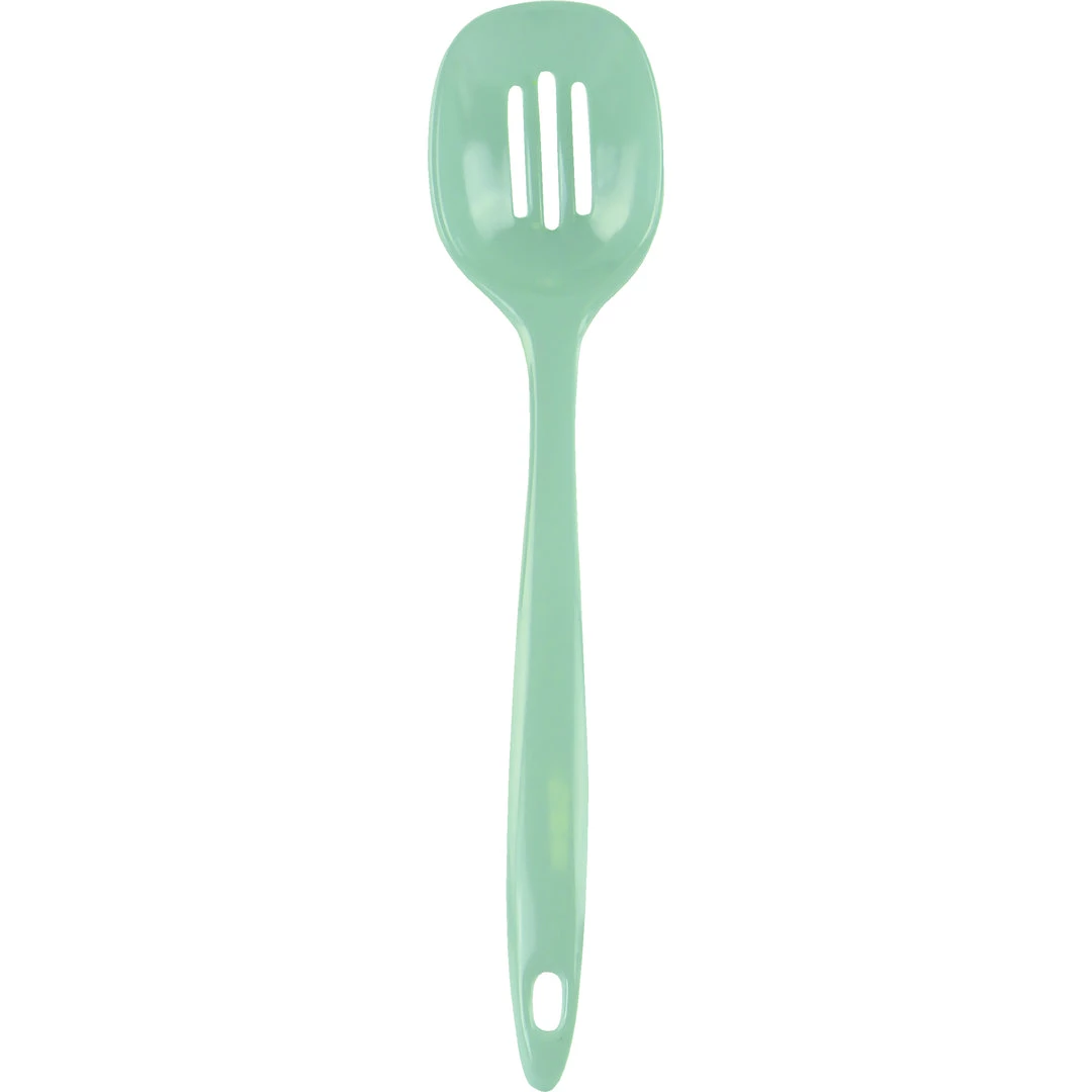 This colorful slotted spoon is made of melamine(plastic)and can be used in any type of cookware since it will not scratch or damage pots or pans.