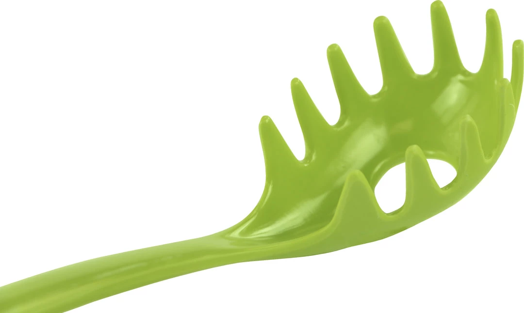 This colorful spaghetti fork is made of melamine (plastic) and can be used in any type of cookware since it will not scratch or damage pots or pans.