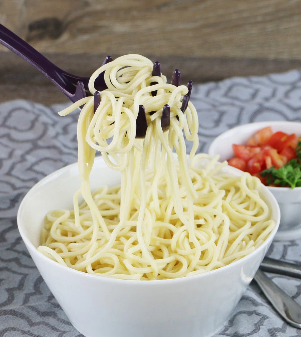 This colorful spaghetti fork is made of melamine (plastic) and can be used in any type of cookware since it will not scratch or damage pots or pans.