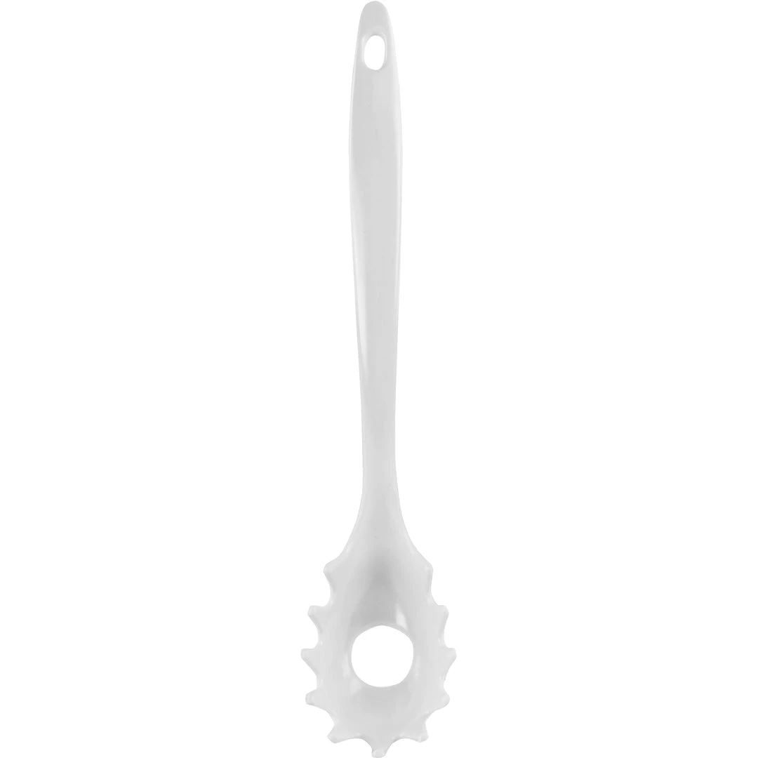 This colorful spaghetti fork is made of melamine (plastic) and can be used in any type of cookware since it will not scratch or damage pots or pans.