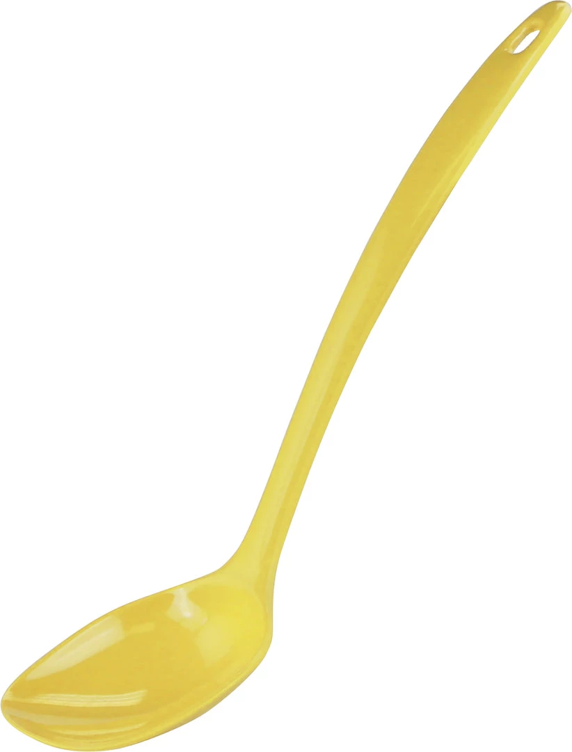 This colorful spoon is made of melamine (plastic) and can be used in any type of cookware since it will not scratch or damage pots or pans.