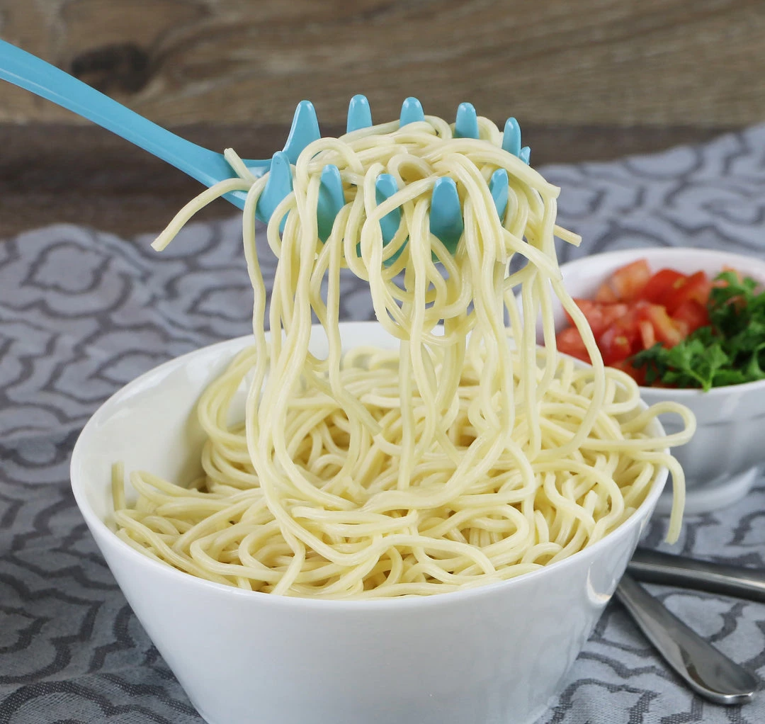 This colorful spaghetti fork is made of melamine (plastic) and can be used in any type of cookware since it will not scratch or damage pots or pans.