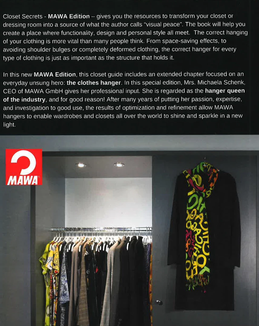 Closet Secrets lets you immerse yourself in the world of the perfect wardrobe. In cooperation with Amy Jane Thomas and the MAWA team comes this helpful guidebook. With Mawa clothes hanger variations in shape, color, and function, they show readers which clothing hangers are ideal for which item of clothing, what makes a good clothing hanger, and how you can create with Amy calls “Visual LPeace: in your closet.